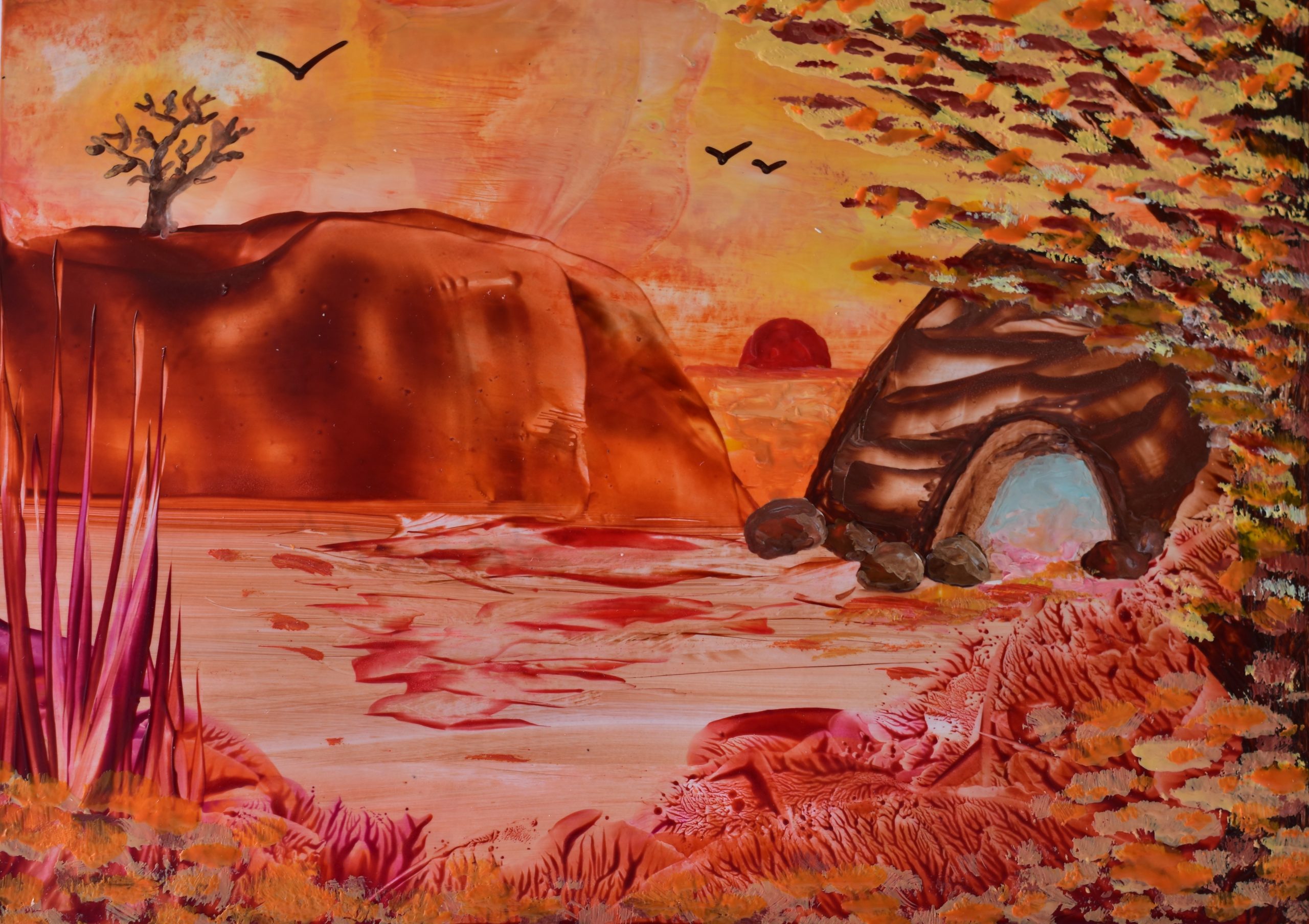 Dit kunstwerk is een warm, aards schouwspel dat de kijker meeneemt naar een onbekend landschap of een buitenaardse planeet. Het kan symbool staan voor de oerkracht van de natuur of een innerlijke reis naar een warme, veilige plek. De grot biedt beschutting, terwijl de heuvels de oneindige ruimte daarbuiten vertegenwoordigen.